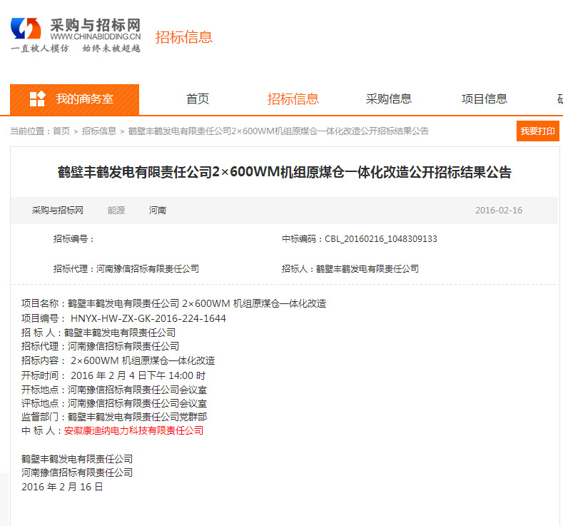 鹤壁丰鹤发电有限责任公司2×600MW机组原煤仓一体化改造 中标公示