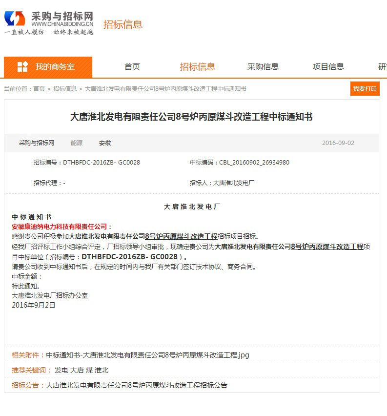 恭喜我公司在大唐淮北发电邮箱责任公司8号炉丙原煤斗改造工程招标公告。